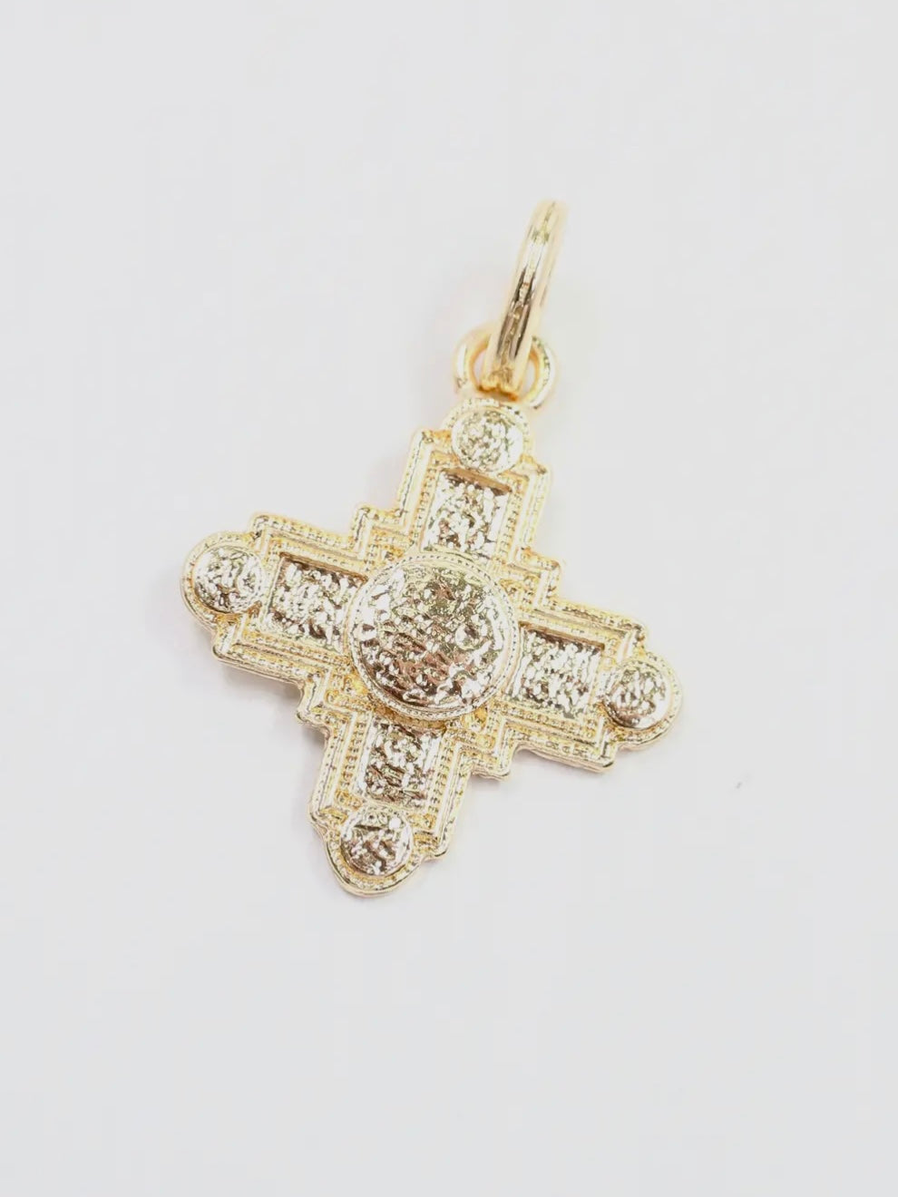 • Add a touch of vintage charm to your look with the Brunson Cross Charm in Gold. Featuring a textured block cross design and a handy hinged clasp, this playful pendant is perfect for layering or wearing solo to brighten any outfit with timeless style.