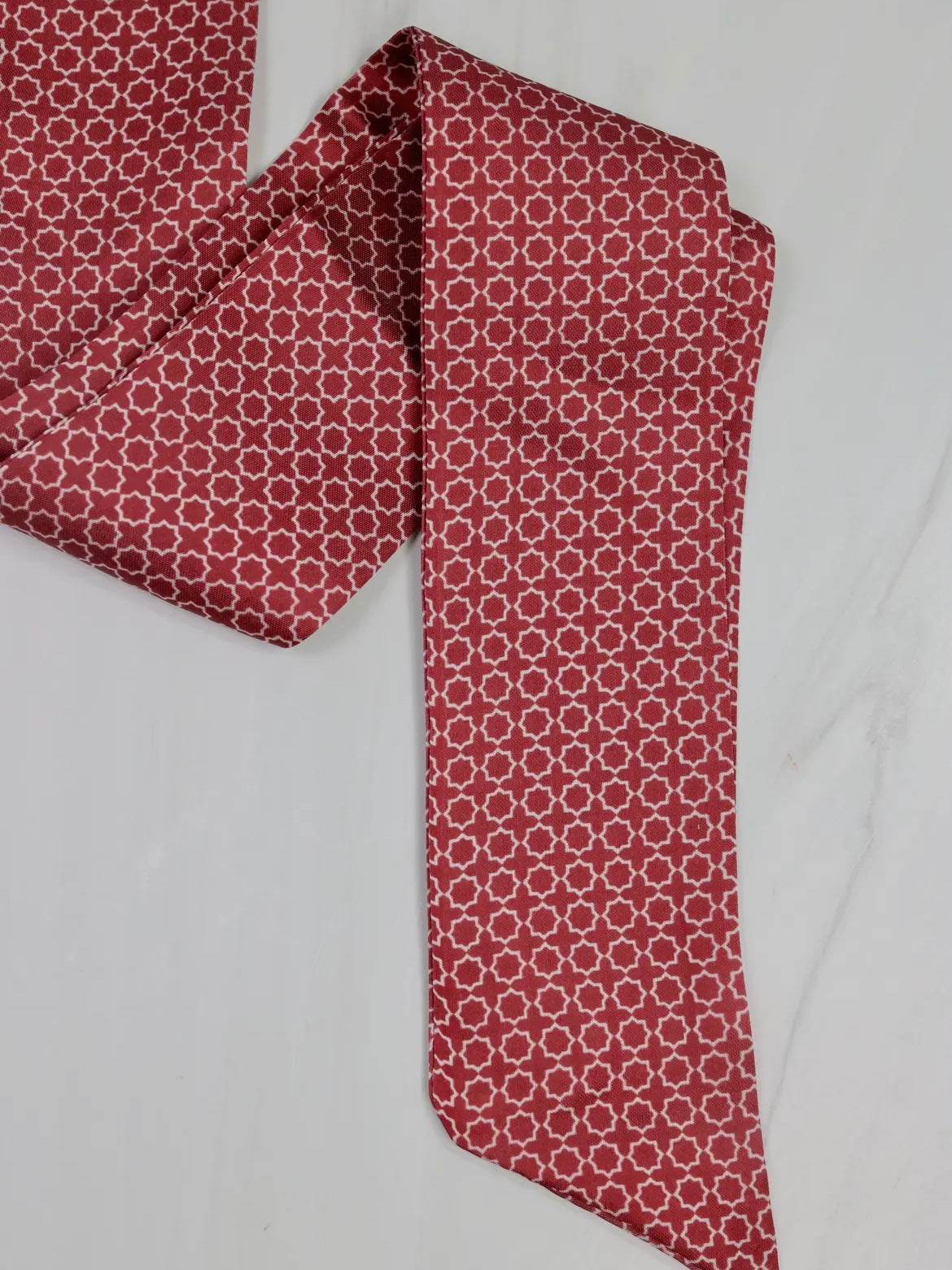 - Add a stylish touch to any outfit with the Serafina Scarf in a beautiful crimson print. Its smooth satin-like texture makes it perfect for tying around your neck, wrist, bag, or even your cowgirl boots, adding a playful and fashionable flair wherever you wear it.
