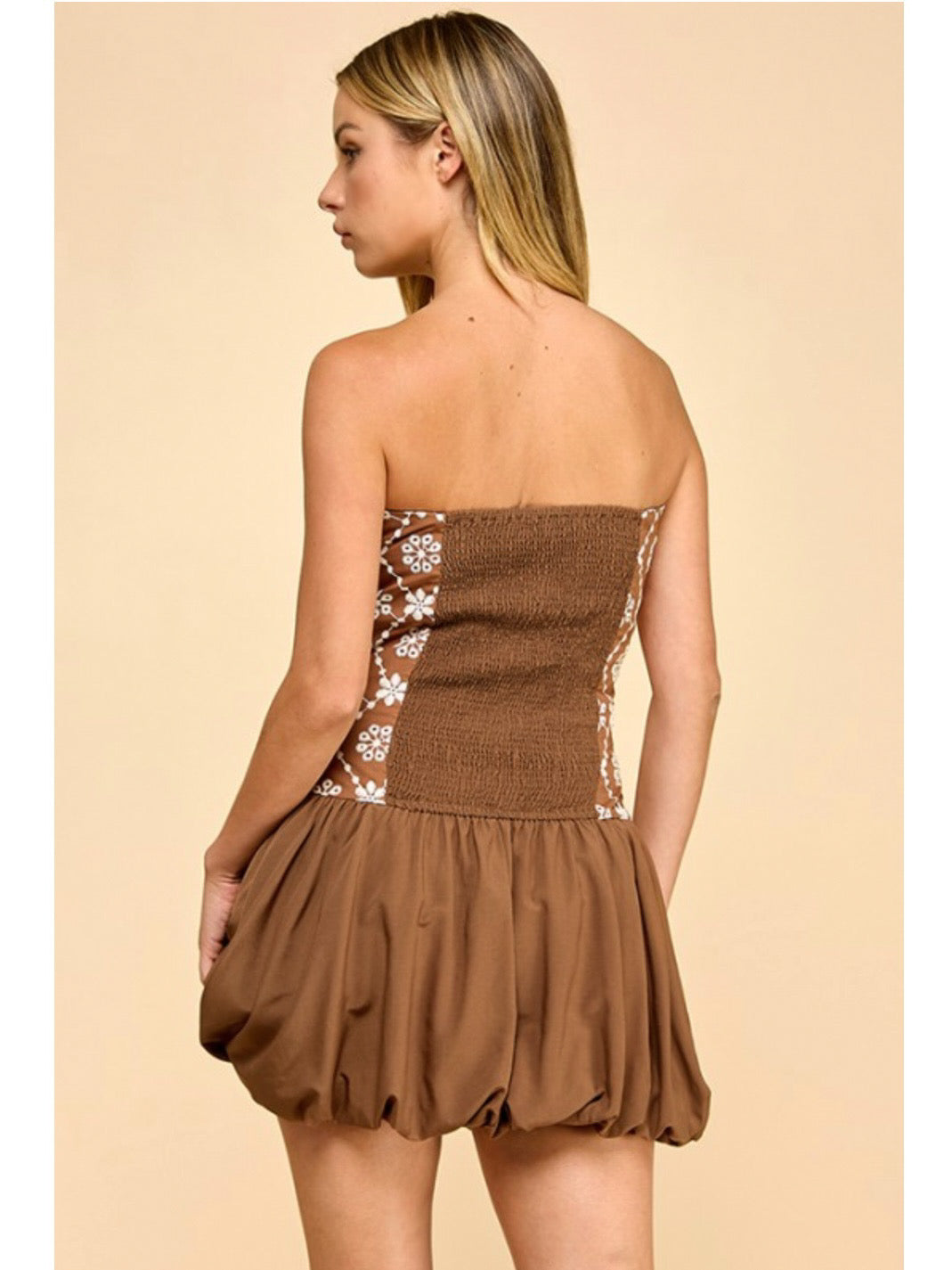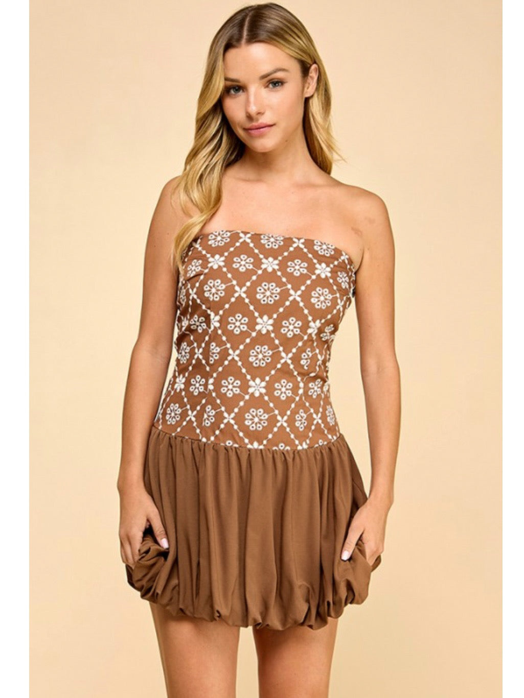 • Floral embroidery print bodice tube mini dress with bubble hem