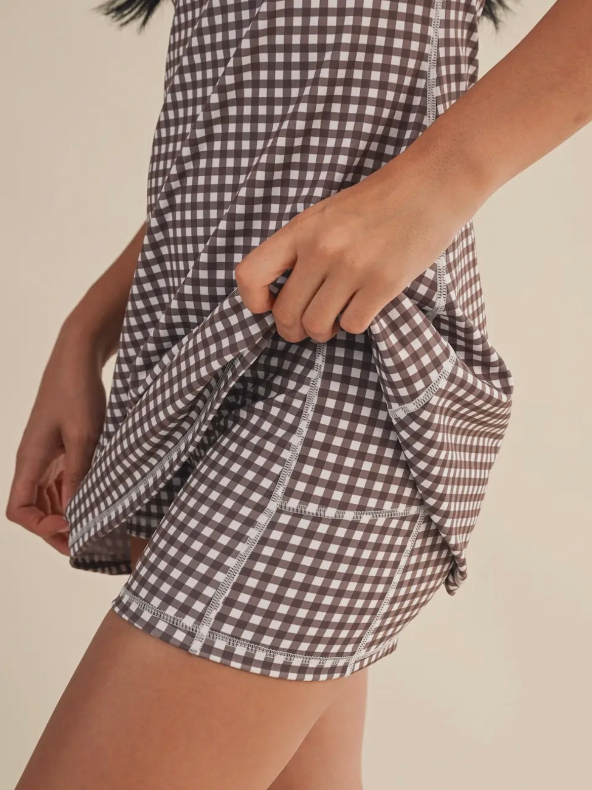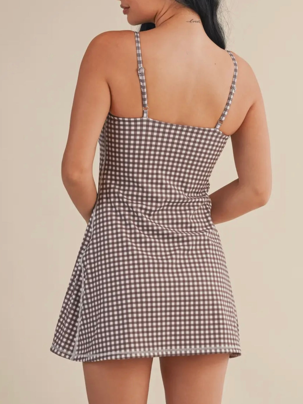 • Trendy and functional gingham print exercise dress comes with built-in bra, spaghetti straps, short liners, and four-way stretch fabric to give you support and comfort wherever your day takes you.