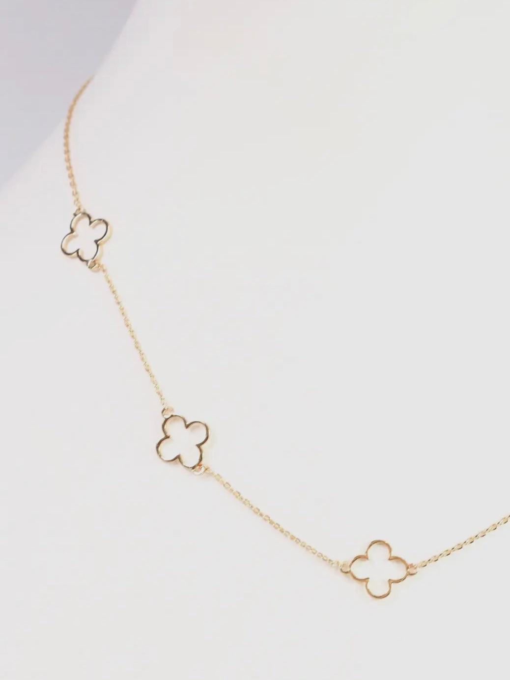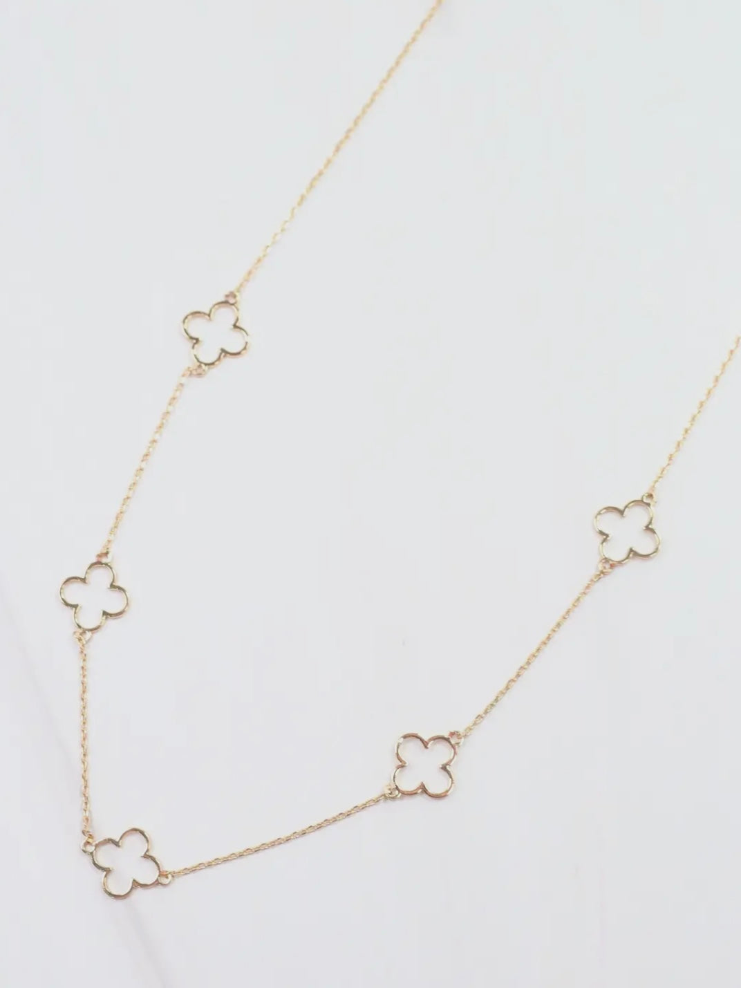 The Dovie Clover Necklace in Gold features a delicate chain adorned with thin, open clover charms, creating a charming and elegant look. Its subtle design makes it perfect for layering with other necklaces, adding a touch of sophistication to any outfit.