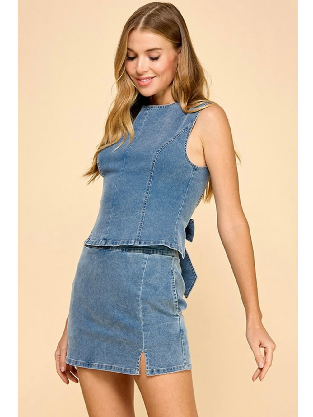 • Round neckline open back denim top with back ribbon strap and skort with side slit open detail